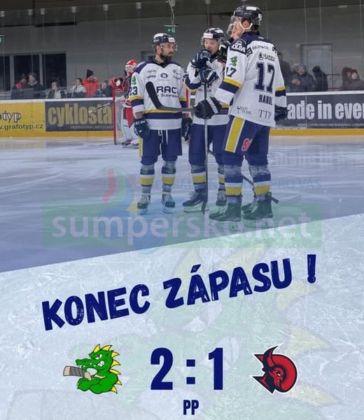 Hokejisté Šumperka potvrdili v sobotu 1. listopadu na domácím ledě roli favorita, na vítězství se však pořádně nadřeli. Proti Novému Jičínu se dlouho trápili v koncovce a když už přišel kýžený gól v podání Tobiáše Handla, Ďáblové dokázali vyrovnat. Po šedesáti minutách hry tak platil nerozhodný stav 1:1. O bonusovém bodu pro Draky nakonec rozhodl v prodloužení Jakub Lehečka, který svým bekhendovým blafákem rozjásal domácí tribuny.