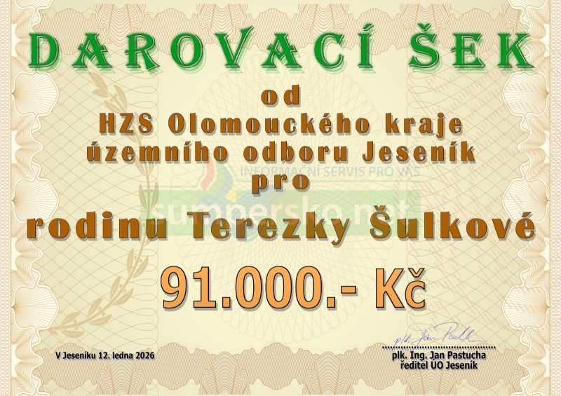 Díky prodeji hasičského punče vybrali jeseničtí příslušníci rekordních 91 tisíc korun. „Moc děkujeme všem, kdo si u nás punč o dvou adventních nedělích koupili. Pomohli nám vybrat neuvěřitelnou sumu. Peníze velmi pomohou rodině Terezky Šulkové, jejíž táta je starostou SDH Stará Červená Voda,“ poděkoval ředitel územního odboru Jeseník Jan Pastucha.