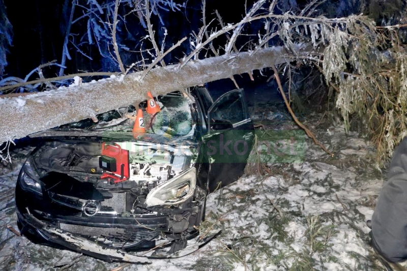 „Těsně před vozidlem začal padat pod náporem sněhu jehličnatý strom. Padesátiletý řidič již nestihl dobrzdit a strom mu spadl na auto,“ uvedla tisková mluvčí policie Olomouckého kraje Ivana Skoupilová, která upřesnila: „ Nehoda se obešla bez zranění. Dechová zkouška vyloučila u řidiče přítomnost alkoholu. Policisté vyčíslili hmotnou škodu na 150 tisíc korun.“