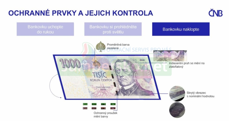 Kontrola ochranných prvků bankovek se dá provést ve třech základních krocích. „Při uchopení bankovky do rukou je možné prsty nahmatat plastické linie na části portrétu osobnosti a na hodnotovém čísle. Další ochranné prvky jsou viditelné proti světlu,“ upozorňuje Karina Kubelková. Řadí se sem vodoznak, ochranný proužek nebo soutisková značka.„ Nakonec při sklopení bankovky lze pozorovat opticky proměnlivé prvky, například skrytý obrazec a na bankovkách vyšších nominálních hodnot i proměnlivou barvu nebo iridiscentní pruh,“ dodává.