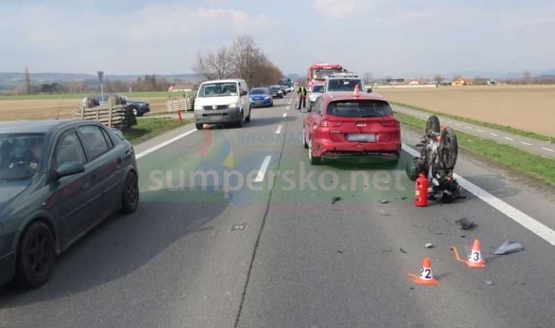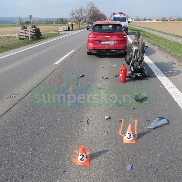 Po třinácté hodině ve čtvrtek 19. března vyjížděli policisté k dopravní nehodě mezi osobním vozidlem a motocyklem na silnici I. třídy č. 44 mezi obcemi Mohelnice a Libivá.