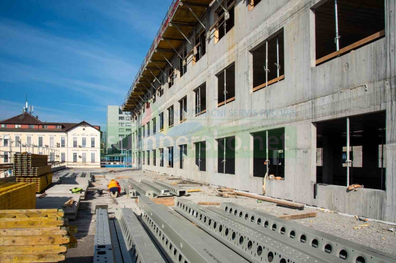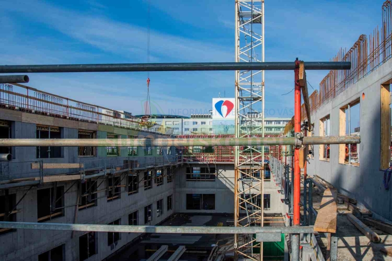 „Hotovo ale zdaleka není jen nahoře. Současně vznikají spojovací koridory mezi objekty A a B, dokončuje se vjezdová rampa do podzemních garáží a uvnitř budovy už se začínají rýsovat konkrétní místnosti. Přibývají sádrokartonové příčky a naplno běží instalace technologií – elektřiny, vzduchotechniky, chlazení i vytápění,“ uvedl tiskový mluvčí Adam Fritscher, který upřesnil: „Na stavbě se denně pohybuje asi sto deset lidí různých profesí. Každý den tak posouvají o kus dál projekt, který výrazně promění budoucnost nemocnice.“