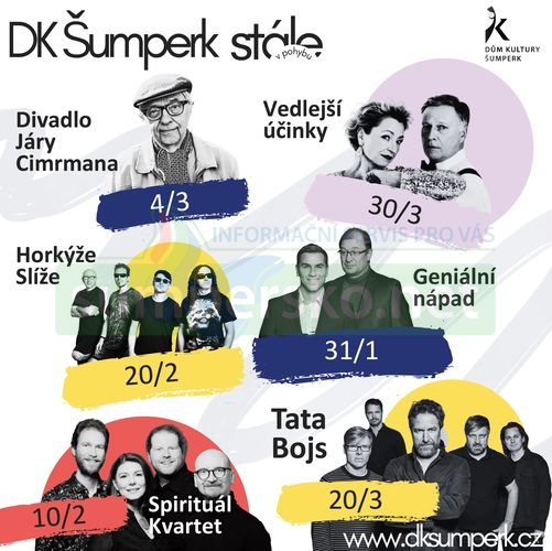 „Název našeho celoročního programu 2026 - Stále v pohybu odráží skutečnost. Příští rok pro nás bude nabitý a plný změn a překvapení. Už v těchto dnech si milovníci kultury mohou v pokladně DK koupit vstupenky na koncerty Tata Bojs, Spirituál kvartetu nebo na představení Divadla Palace či Losers Cirque Company. V běhu už jsou přípravy na třetí Šumný Šumperk, na kterém se budou svou účastí podílet autoři cyklu Šumná města David Vávra a Radovan Lipus a hlavní hvězdou večera bude Kateřina Marie Tichá,“ prozradila jednatelka Domu kultury Šumperk Hana Písková.