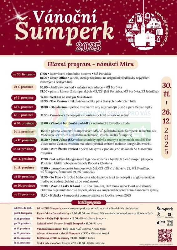 "Musím říci, že letošní dramaturgie je skutečně jednou z nejlepších, jaké jsme kdy šumperskému publiku u radnice mohli nabídnout. Slavnostní rozsvěcení stromu doprovodí brněnská skupina Cover Office, jejíž členové sami říkají, že hrají světové i české hity tak, jak je chtěli slyšet jejich původní autoři, ale nenašli k tomu odvahu," láká za Dům kultury Šumperk Ondřej Procházka.