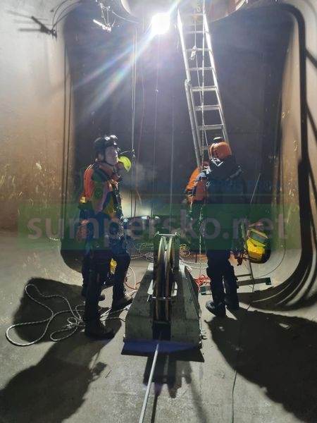 K dělníkům se do hloubky spustili dva lezci, kteří je zajistili na vozíku proti pádu. „Do bezpečí byla v první fázi pomocí navijáku vytažena skupina ve složení lezec a dva servismani. Pak byl spuštěn další lezec, který k mužům znovu dopravil záchranné lano. Ve druhé skupině byli vytaženi dva lezci a dva zachraňovaní pracovníci. Dramatický a neuvěřitelně psychicky i fyzicky náročný zásah komplikovalo několik faktorů: tma, vlhko, hloubka, konstrukce tubusu, čas a špatné spojení, které ztížilo komunikaci při velení. Hasiči-lezci museli také přizpůsobit taktiku zásahu fyzickému a psychickému stavu zachraňovaných zaměstnanců, kteří po několika hodinách již jevili známky stresu, vysílení a podchlazení. Zásah byl na místě ukončen ve 14.50 hodin, kdy se do bezpečí dostali všichni dělníci,“ přiblížila další průběh mluvčí Balážová.